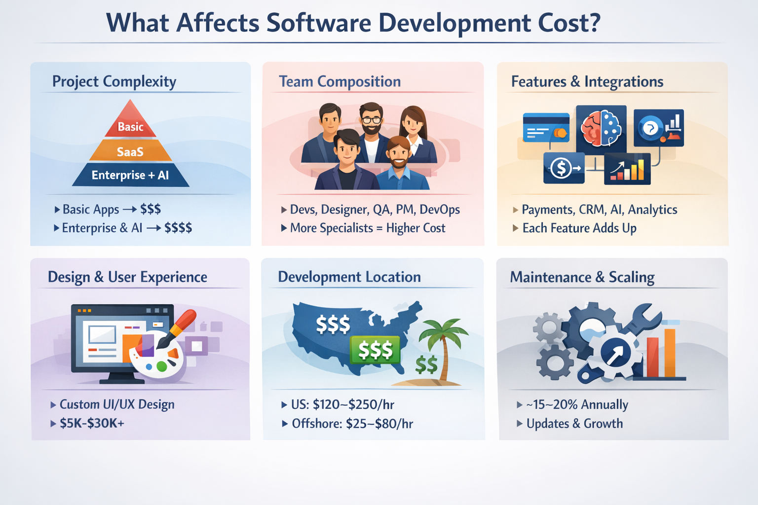 Custom UI/UX design can add $5,000–$30,000+ depending on complexity.