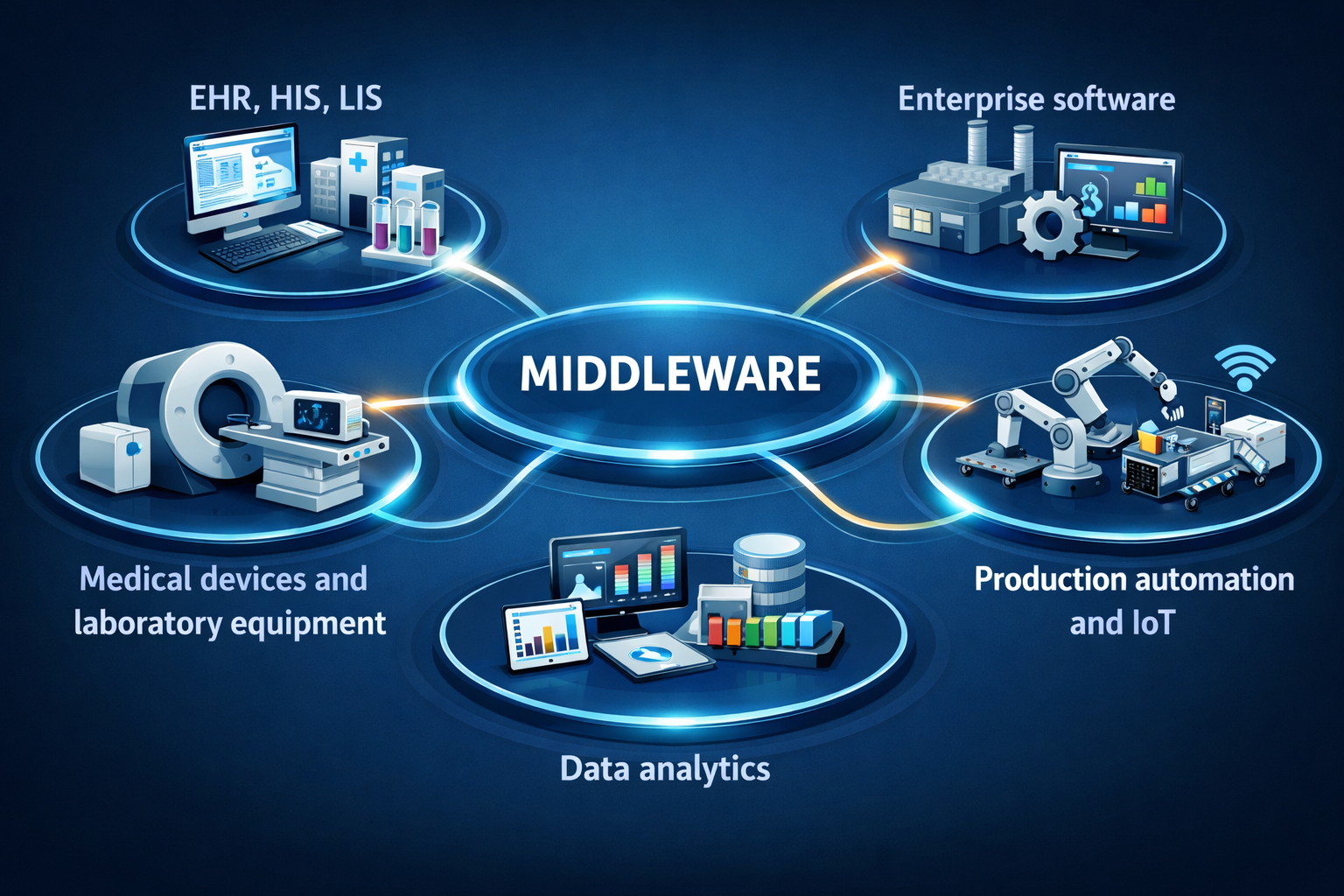 Middleware implementations are rarely simple point-to-point connections. They typically orchestrate communication between multiple systems, devices, and protocols across healthcare and production environments.