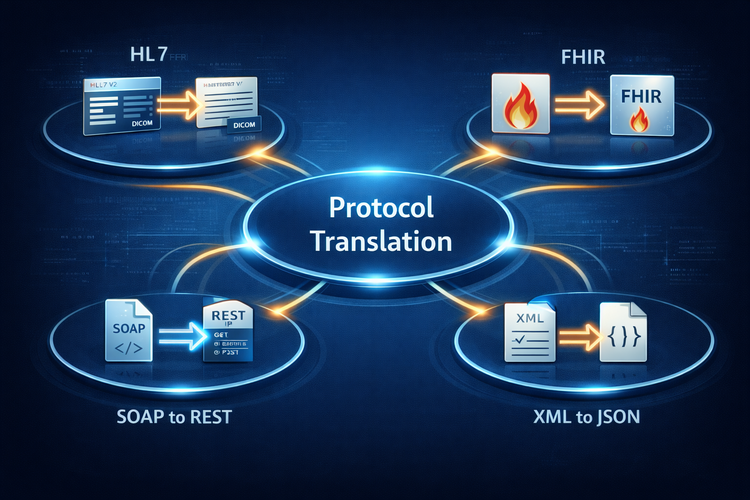 - Communication Protocols: HL7, FHIR, REST APIs, SOAP, OPC UA, Modbus, DICOM