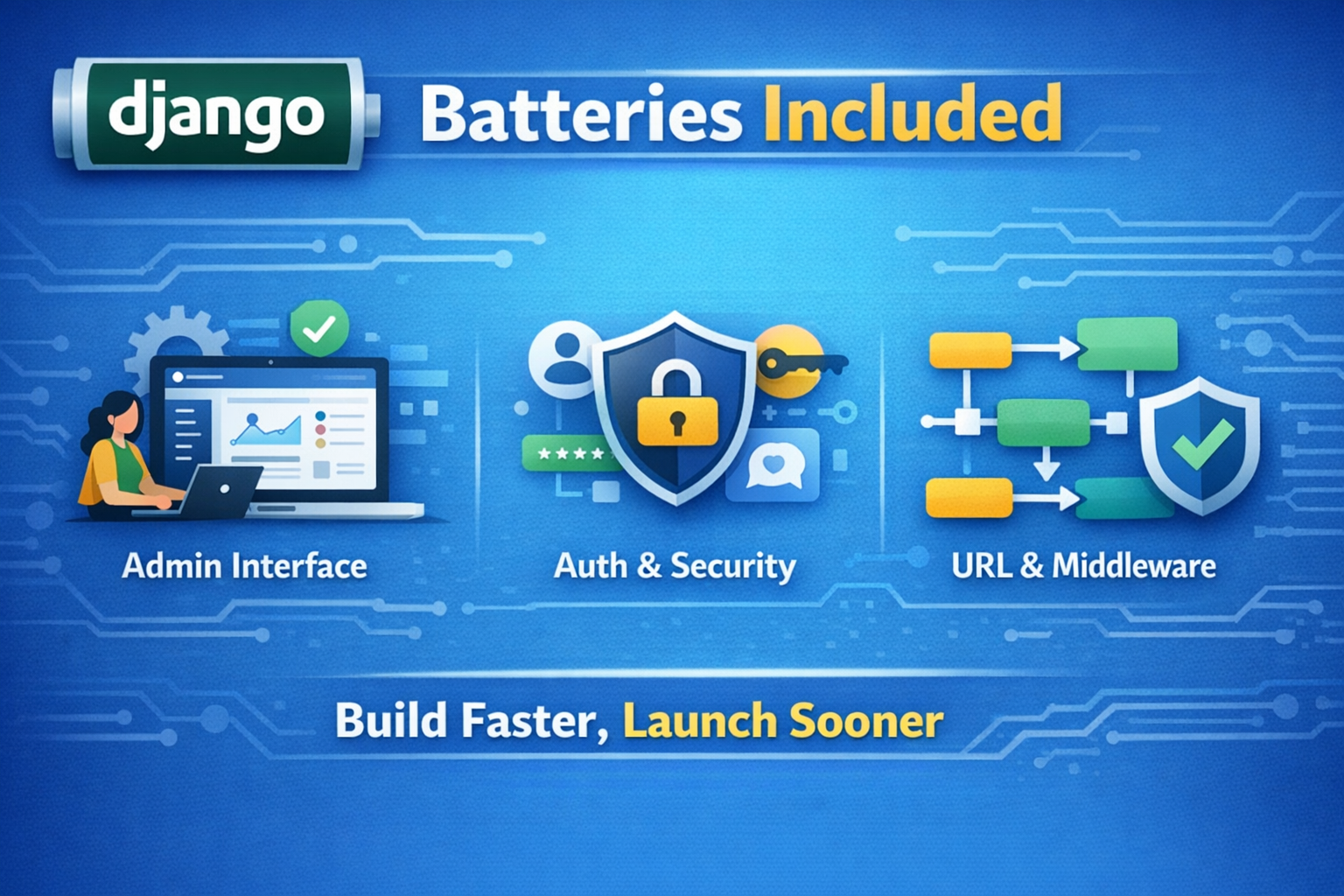 Einer der größten Vorteile von Django ist sein voll ausgestattetes Framework — oft als „Batteries Included“ bezeichnet. Im Gegensatz zu minimalistischen Frameworks, bei denen Entwickler Dutzende von Bibliotheken manuell zusammenstellen müssen, liefert Django sofort eine Reihe wesentlicher Komponenten, die zum schnellen Aufbau von Webanwendungen benötigt werden.
